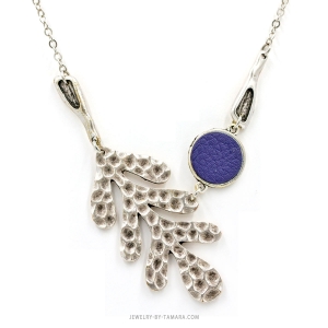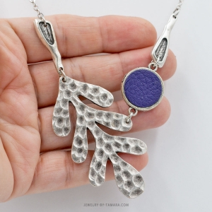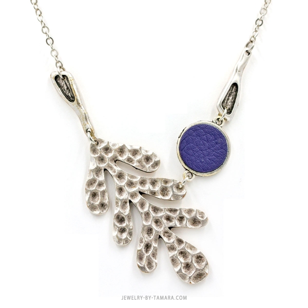 Unique asymmetrical necklace that is created with hammered antique silver and purple leather