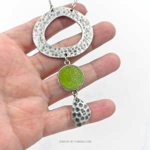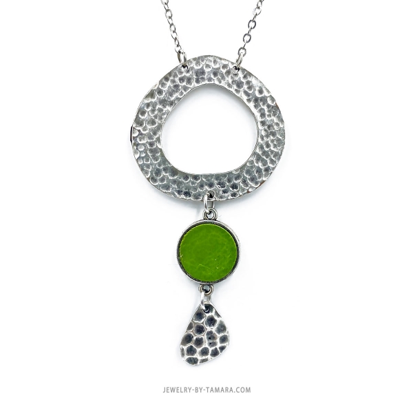 Hammered metal teardrop and green leather in a bezel setting
