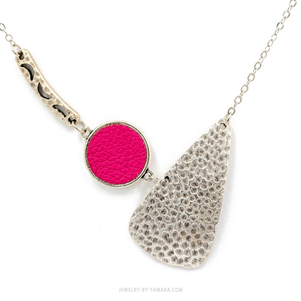 Pink leather and silver plated hammered metal necklace
